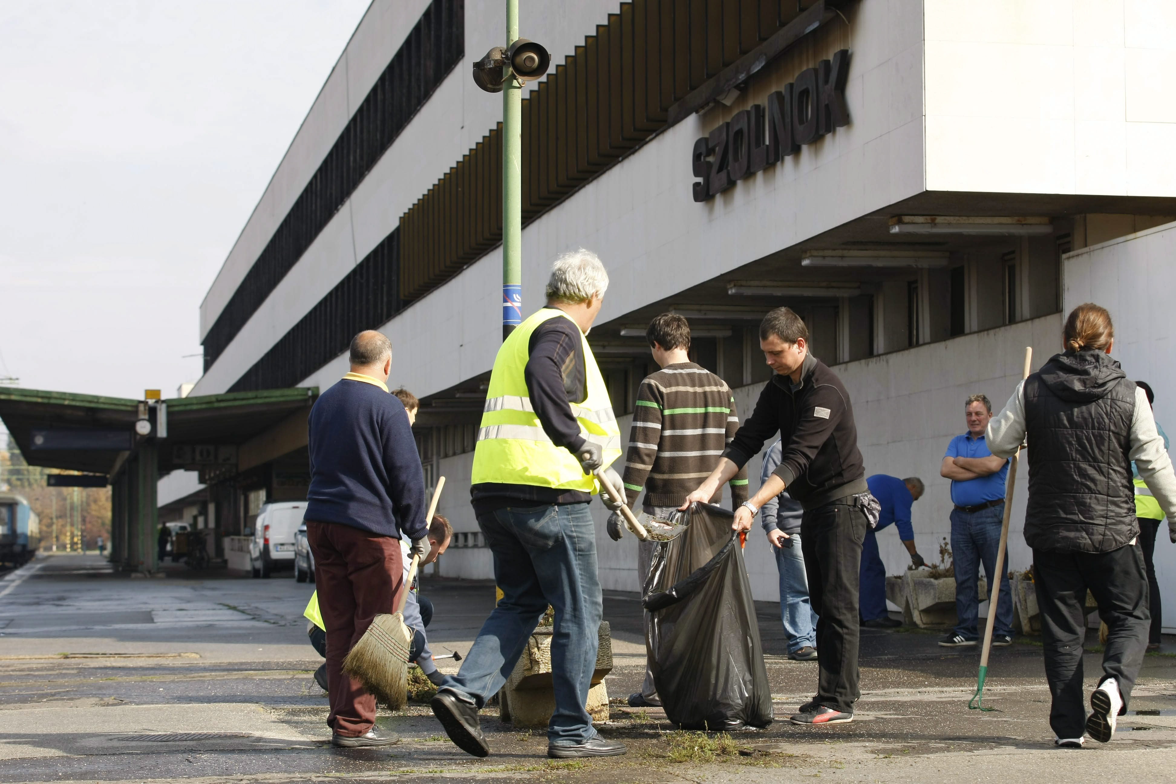 Önkéntes vasúti dolgozók tisztítják meg a gyomtól és az eldobált szeméttől a vasútállomás egyik peronját Szolnokon 2013. október 15-én. Két hét alatt 90 tiszántúli és Duna-Tisza közi állomást takarítanak ki a vasutasok, az október 7-én kezdődött akcióban a MÁV-csoport több száz dolgozója vesz részt.